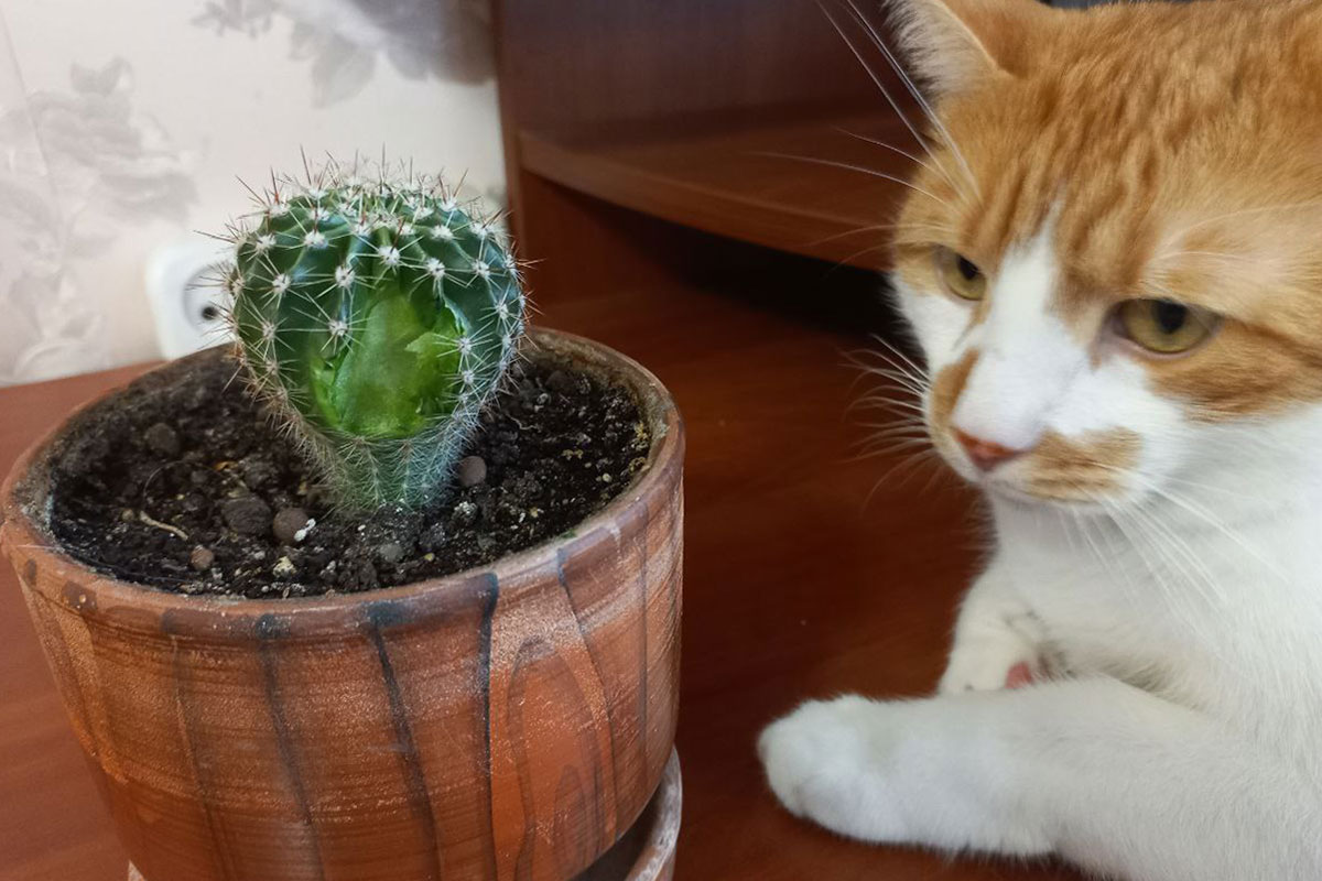 Кошка думает так: я тронула кактус, а он "куснул" меня за лапку – значит, он живой. Поэтому усатый питомец будет трогать, кусать и даже караулить кактус, пока не надоест.