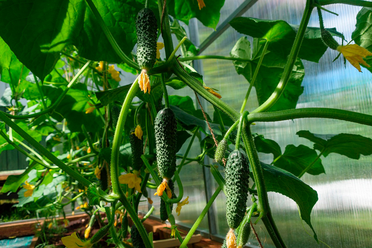 Огурцы растут на аккуратных вертикальных кустах, расположенных прямо на уровне глаз.