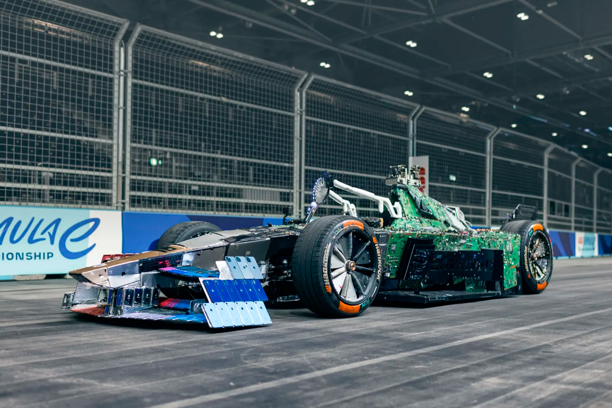 Компания Envision Racing вместе с художником Лиамом Хопкинсом разработала машину "Формулы Е", корпус которой изготовлен из неисправной электроники и компьютерной техники, сообщает New Atlas.