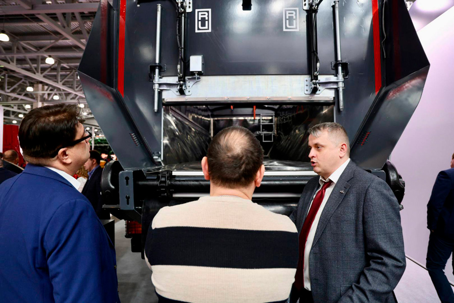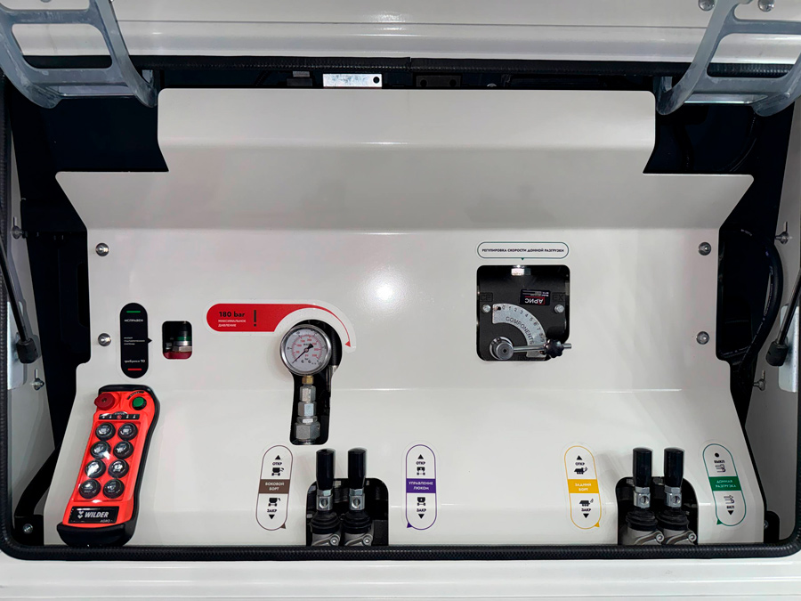 - Машина оснащена вместительным кузовом объемом 26 "кубов" с донным транспортером и специальным защитным покрытием.