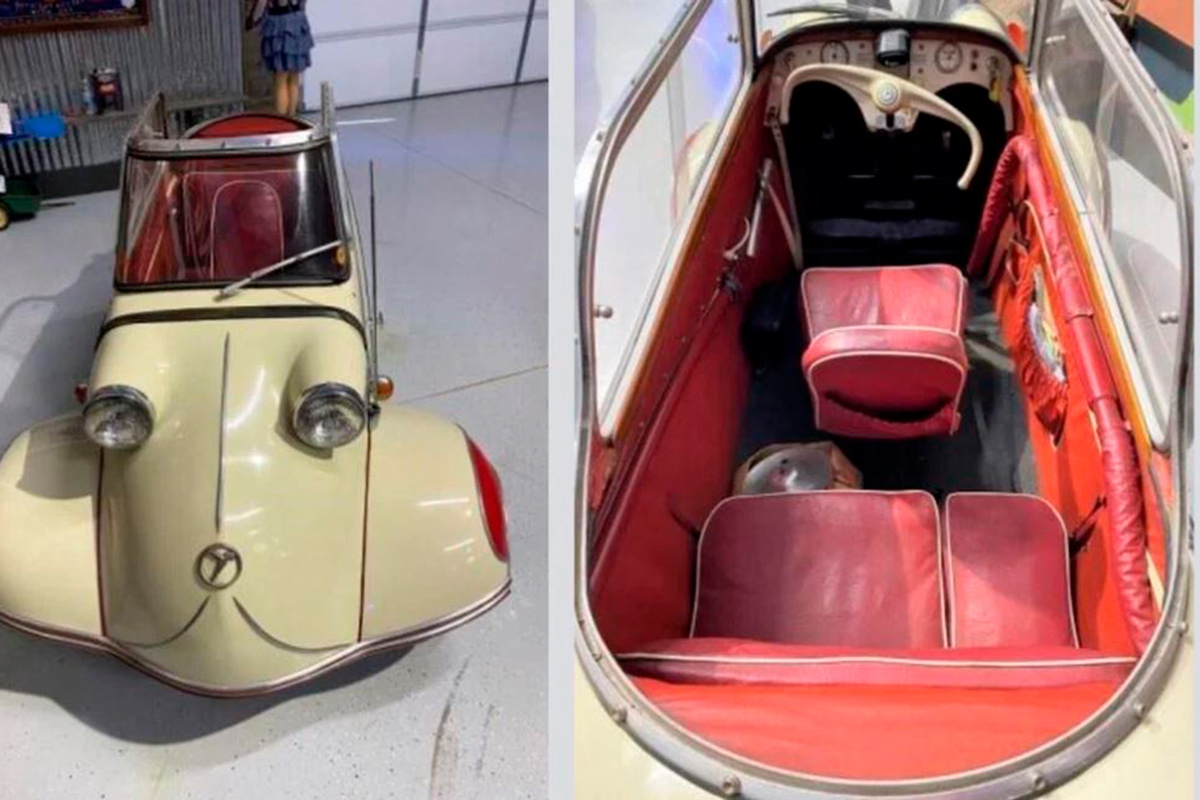 На торги выставили трехколесный микромобиль Messerschmitt KR200 – с мотоциклетной компоновкой и авиационными деталями: штурвал вместо руля и откидной стеклянный фонарь, как в кабине пилота.