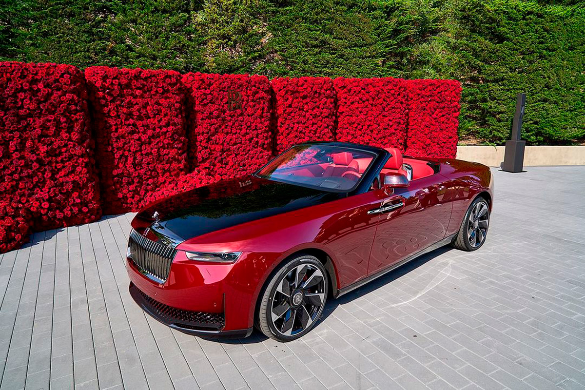 Rolls-Royce Droptail – хамелеон, в тени он черный, а на солнце – перламутрово-красный. Хамелеон стильный – спереди классическая массивная хромированная решетка радиатора, узкая светодиодная оптика. Ближе к корме кузов сужается в каплевидный хвост.
