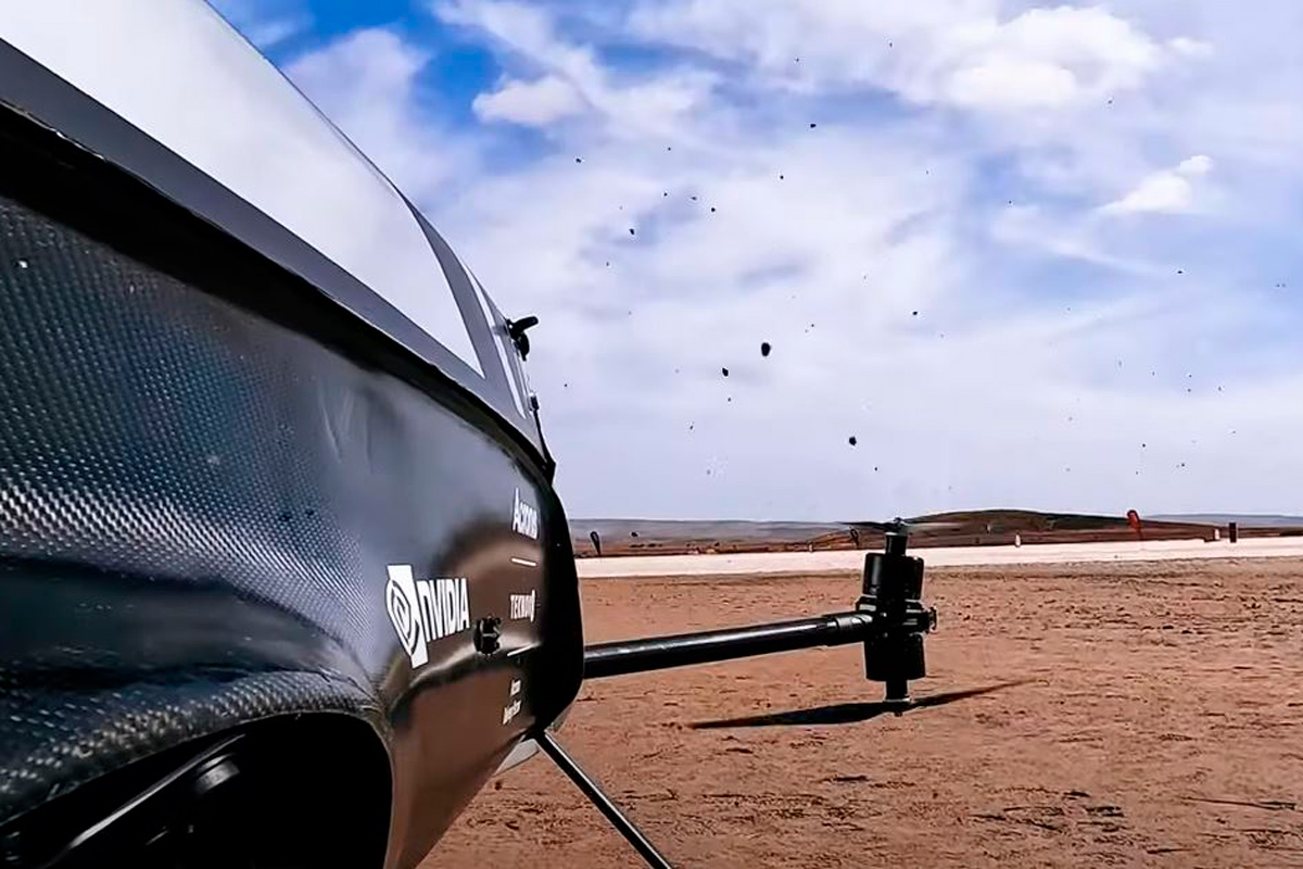 Кольцевая гонка прошла на глади высохшего озера Лоэхиль – три круга по одному километру. Несмотря на небольшую дистанцию, как и в обычных гонках, был и пит-стоп, на котором техники заменили дронам батареи.