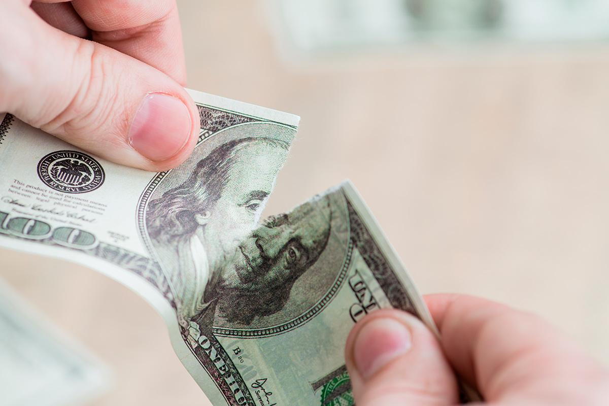 Например, собака вытащила и изгрызла лежащий в шкафу пакет с деньгами, нерадивый супруг постирал джинсы с "соткой" в кармане, ребенок аккуратно вырезал ножницами портрет американского президента с банкноты, забытой на серванте.