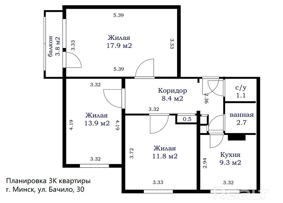 Трехкомнатная квартира продается на первом этаже девятиэтажки 1988 года по адресу Бачило, 30. Площадь жилья – 66,1 м². Из них 9,3 приходится на кухню.