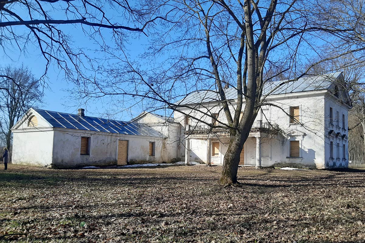 Сам усадебный дом не сохранился – от него остались только подвалы. Здание, которое продают на аукционе, – библиотека с балконом на четырех колоннах.