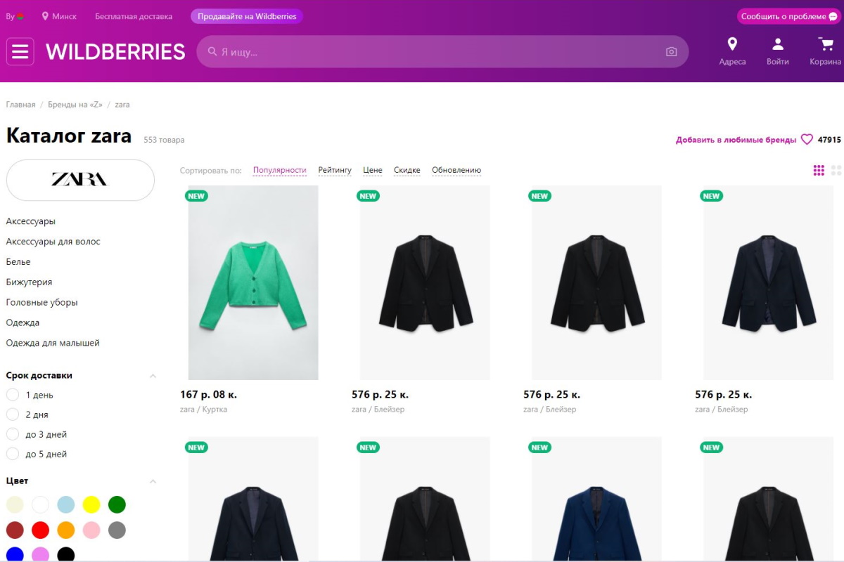 Онлайн-ритейлер Wildberries начал продавать одежду Inditex: для белорусских и российских покупателей доступны бренды Zarа, Massimo Dutti, Bershka и Pull Bear.