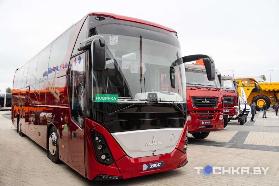 Новинка МАЗа – туристический автобус нового поколения 351. Снаружи – плавные линии и современные светодиодные панели.