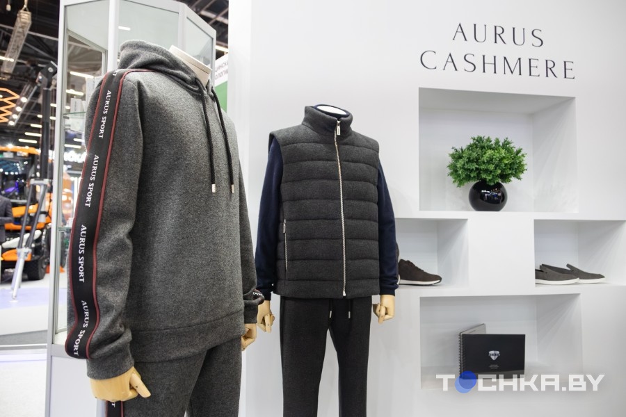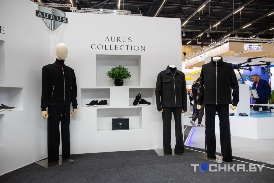 Напротив – одежда от Aurus. Костюмы, обувь и аксессуары с элементами автодизайна. Так что теперь Aurus это не просто автомобили, а стиль жизни. Цены – соответствующие. Сумку, к примеру, можно купить за Br95 тыс.