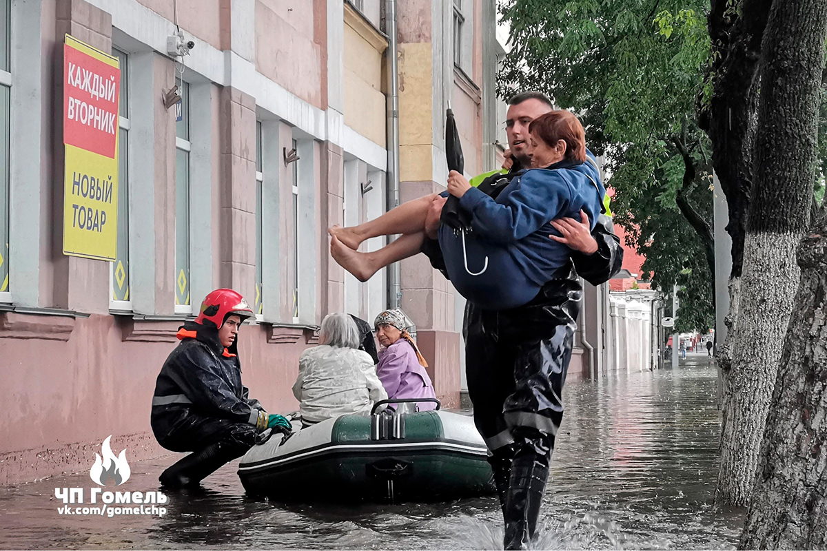 Улицы города затопило так сильно, что пришлось вызывать спасателей. Некоторых горожан они носили на руках, для оперативной помощи пришлось передвигаться по Гомелю на лодках.