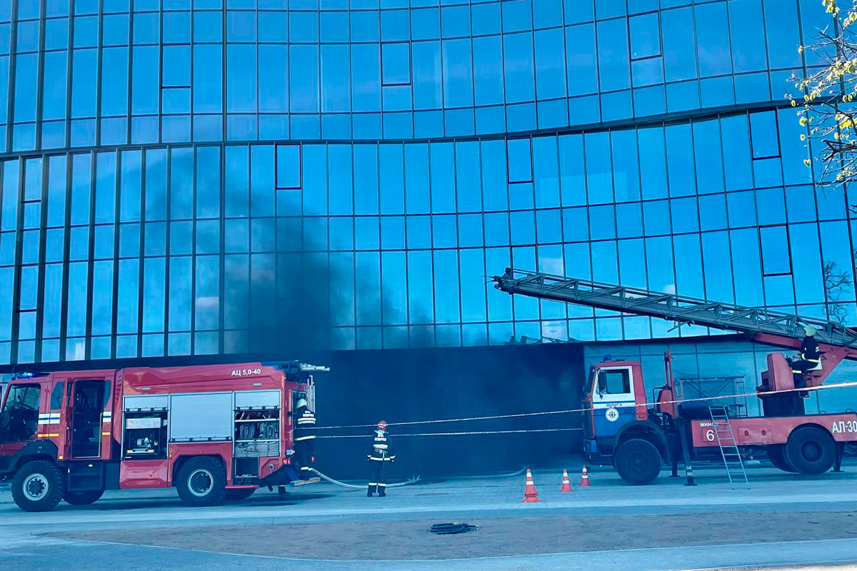 Огонь вспыхнул около двух часов дня 1 мая в почти достроенном офисном комплексе, расположенном на проспекте Победителей в Минске.