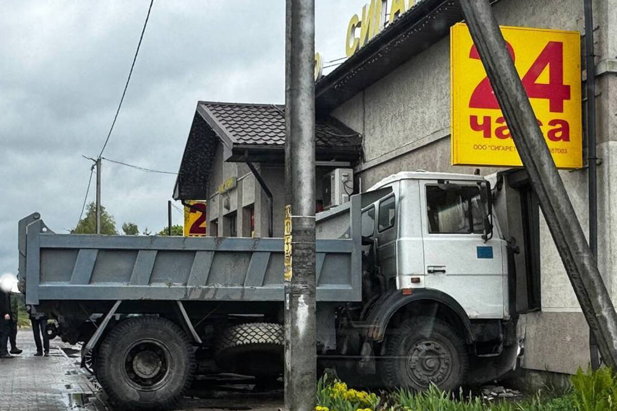 По предварительной информации, все произошло так: перед МАЗом резко затормозила машина – водитель ударил по тормозам и юзом доехал до стены магазина.