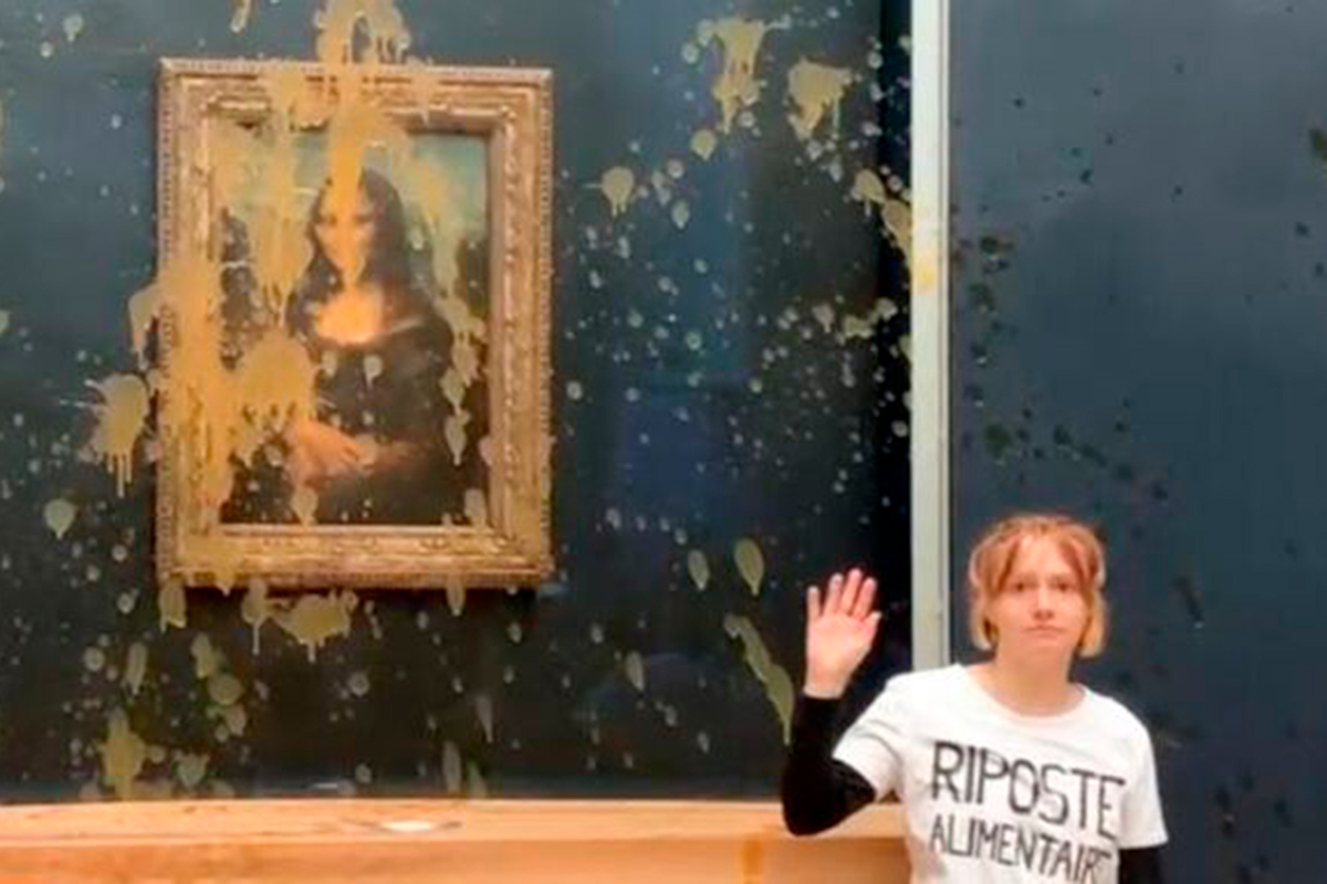Подобные акции протеста по всему миру проходят регулярно. Так, на картинах Ван Гога уже бывали и гороховый, и томатный супы. И вот теперь, кажется, ореховый красуется на лице "Джоконды".
