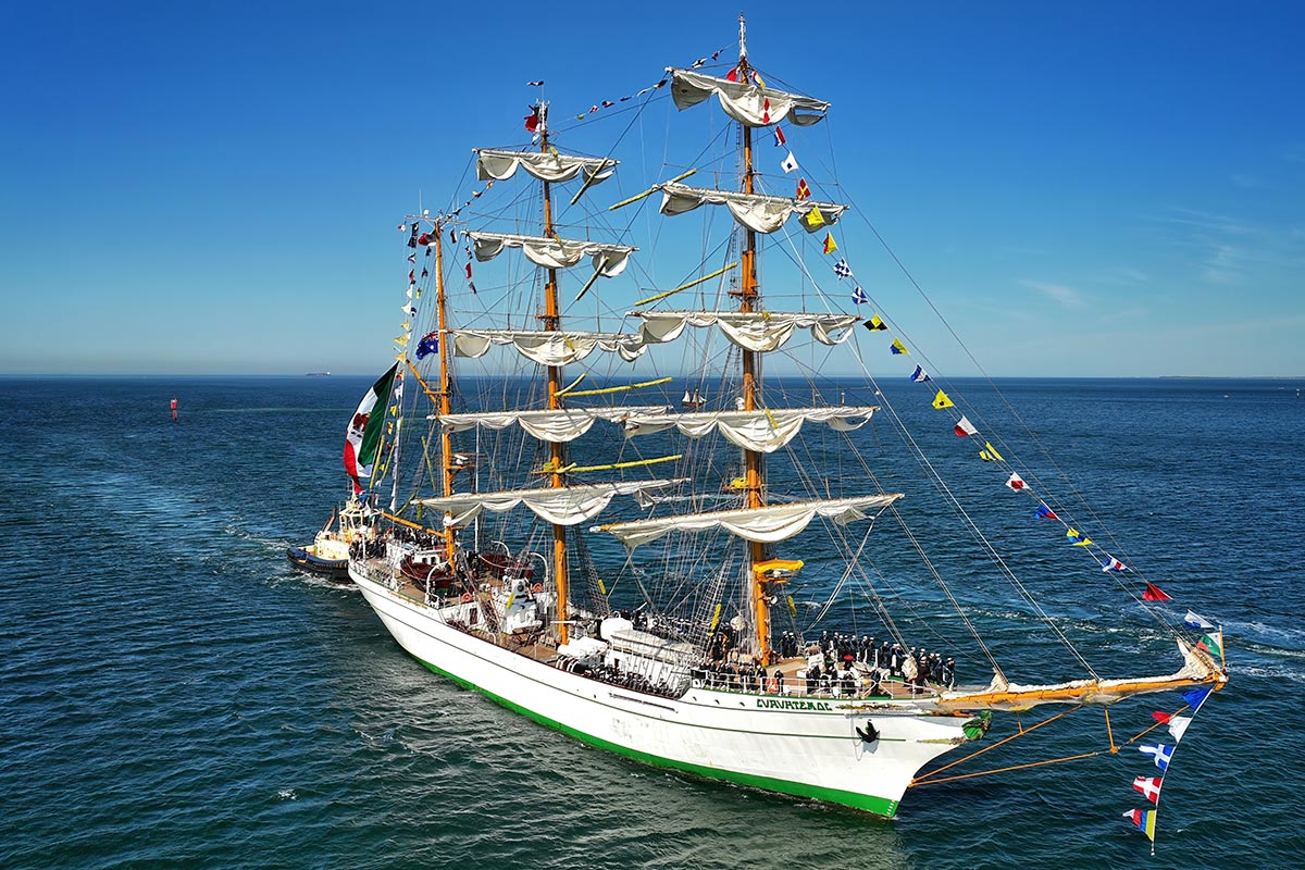 Судно, построенное в Испании в 1982 году исключительно для обучения кадетов, находилось в Нью-Йорке в рамках рекламной акции перед предстоящим в следующем году мероприятием по парусному спорту Sail4th, посвященном 250-летию Америки.