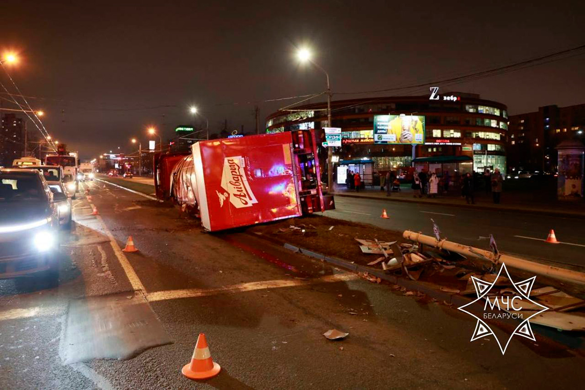 В Минске перевернулась фура, которая, судя по логотипу на борту, перевозит пиво. Видео опубликовало УГАИ ГУВД Мингорисполкома.