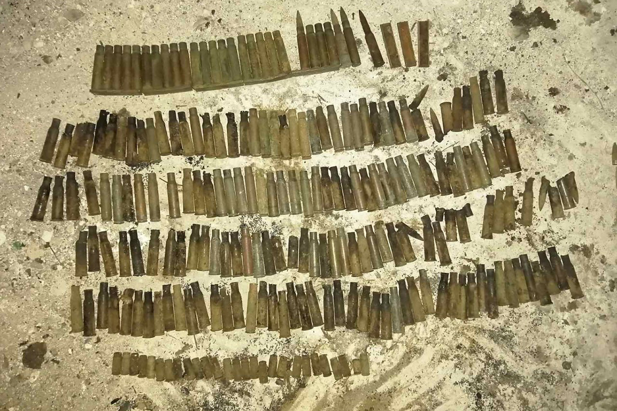 Таким образом, в бункере обнаружены: составные части оружия, корпус от минометной мины, детали винтовки, взрыватели и кольца от гранат, более 200 гильз, а также патроны.