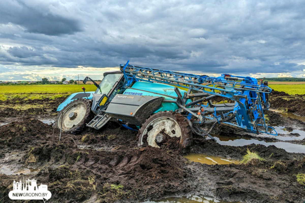 Нетипичная для белорусских полей картина развернулась под Гродно. Проезжая между Заболотью и Путришками можно увидеть утонувшую в грязи сельскохозяйственную технику.