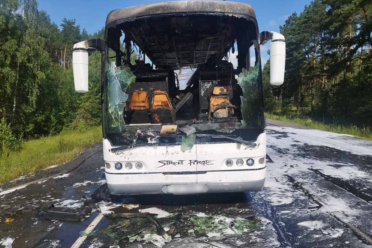 Подробности позже привели сотрудники УВД. Около девяти утра автобус под управлением 35-летнего водителя ехал из Барановичей в Туров по дороге "Гомель-Кобрин". На 350-м км автотрассы произошло возгорание в задней части автобуса.