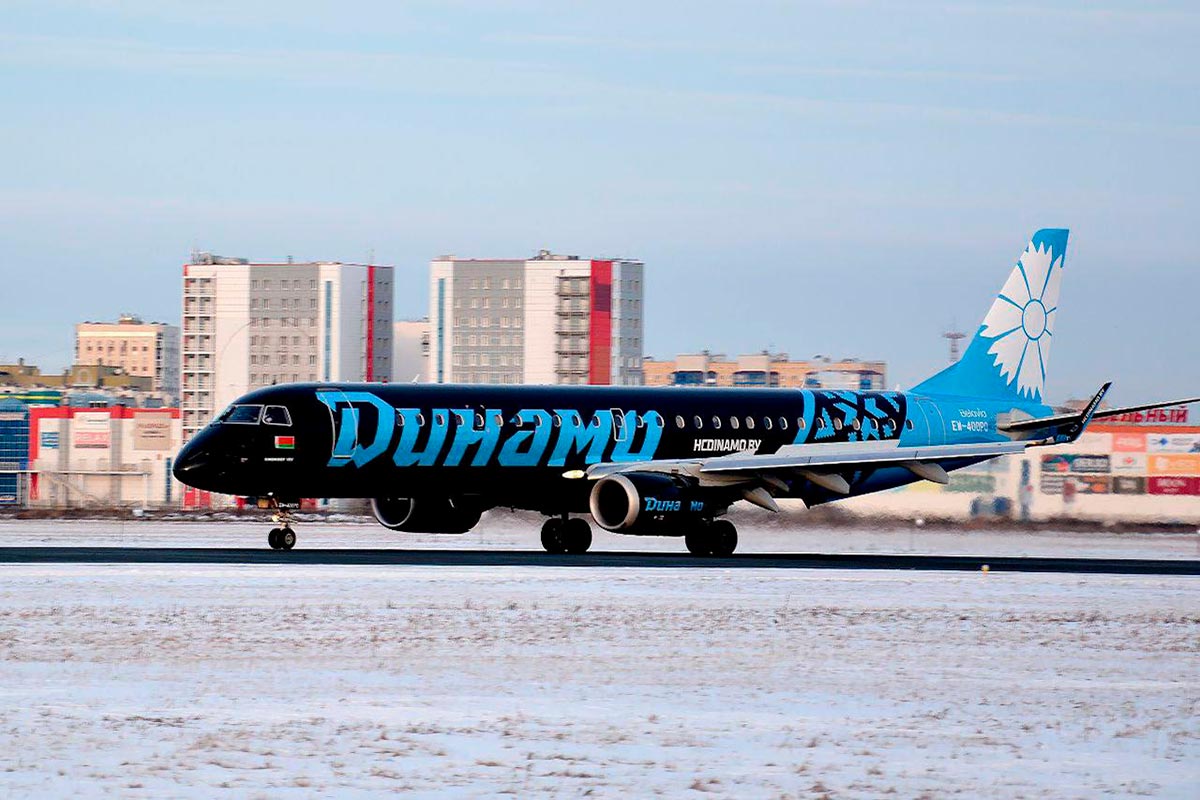 В середине ноября минское "Динамо" совместно с авиакомпанией Belavia презентовало самолет Embraer 195, который был окрашен в клубные цвета "зубров".