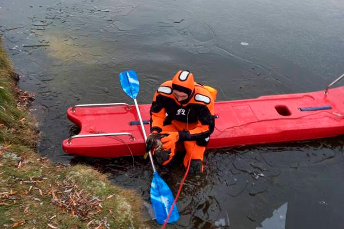 Для спасения работникам МЧС понадобилась специальная доска. На ней спасатель подплыл к птице, прорубил лед вокруг и извлек пернатого из холодного плена.