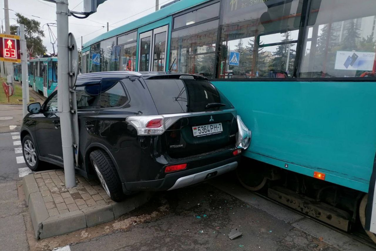 "По предварительной информации, сегодня около 07:50 40-летний водитель автомобиля Mitsubishi, двигаясь по Логойскому тракту, со стороны улицы Белинского при повороте направо на улицу Волгоградскую на разрешающую дополнительную секцию светофора не уступил дорогу трамваю, движущемуся в попутном направлении", говорится в сообщении.