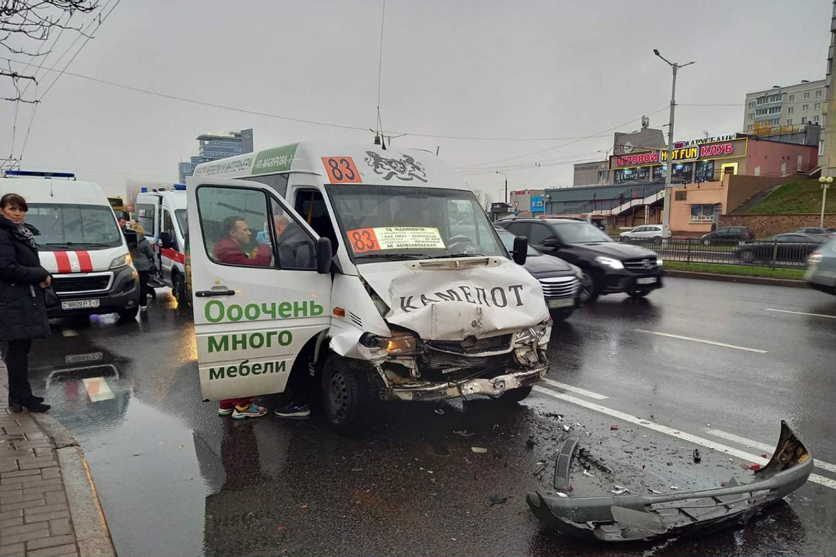 В Минске столкнулись маршрутным такси Mercedes и троллейбус. Дело было ближе к вечеру на улице Притыцкого.