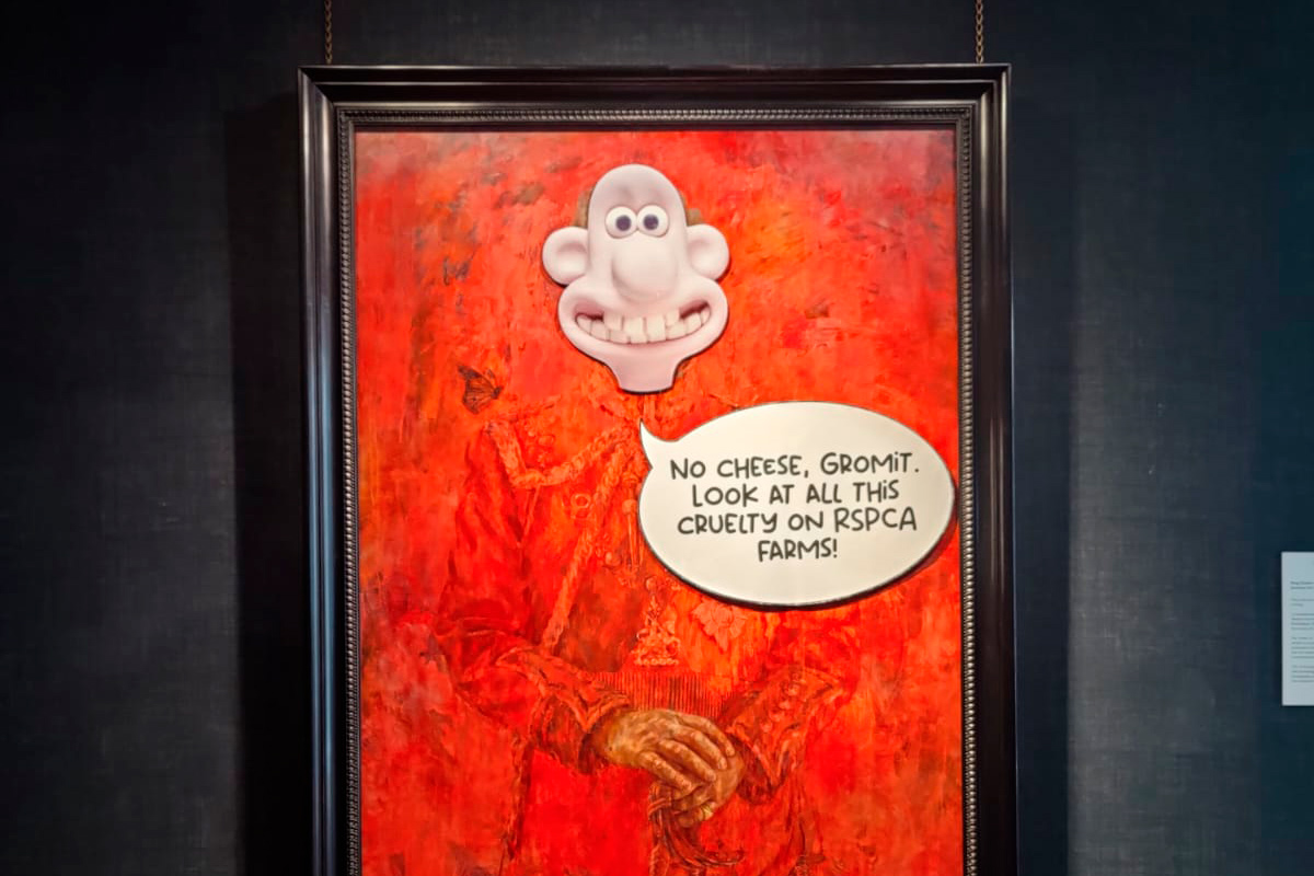 Активисты с помощью малярных валиков наклеили на защитное стекло стикер с лицом изобретателя Уоллеса. Рядом разместилось облачко с репликой, которую он произносит, критикуя Королевское общество по предотвращению жестокого обращения с животными (RSPCA).