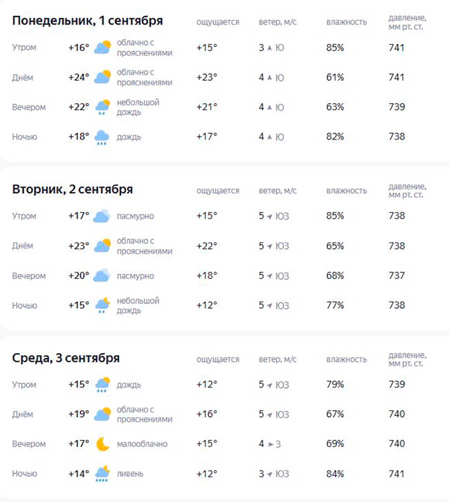 Так, в последний день лета ожидается до 23°С и без осадков, а вот уже 1 сентября небо будет немного пасмурным.