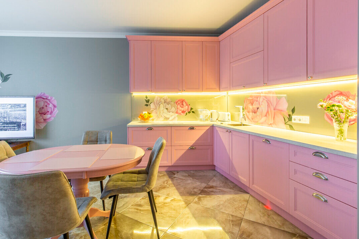Важное уточнение: этот самый крашенный МДФ – розового цвета. На стенах в гостиной декоративная роспись в таких же тонах.