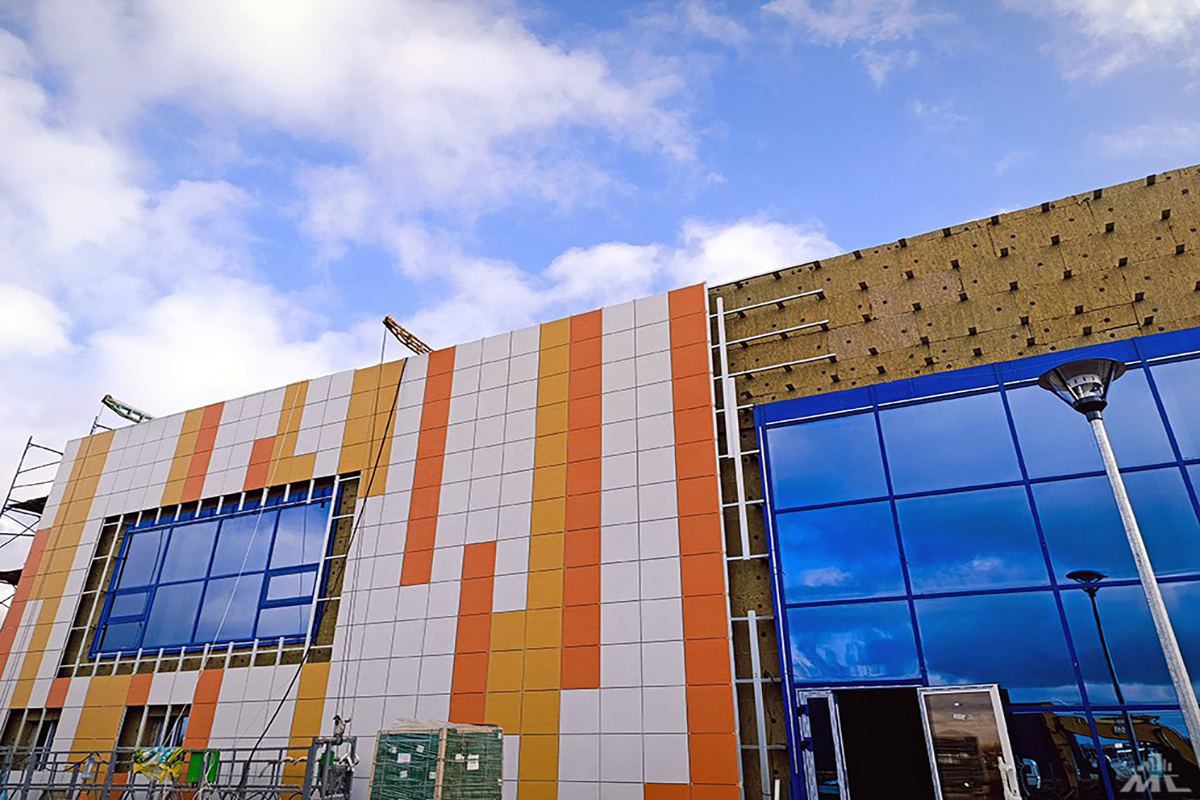 После установки витражей специалисты приступили к окраске отдельных зон и монтажу вентфасада.