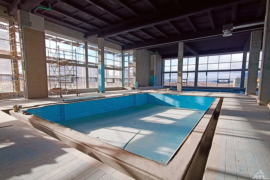 Бассейны, джакузи и купель испытаны на гидроизоляцию. Два бассейна облицованы плиткой, основной – в работе. А еще начато устройство комплекса бань.