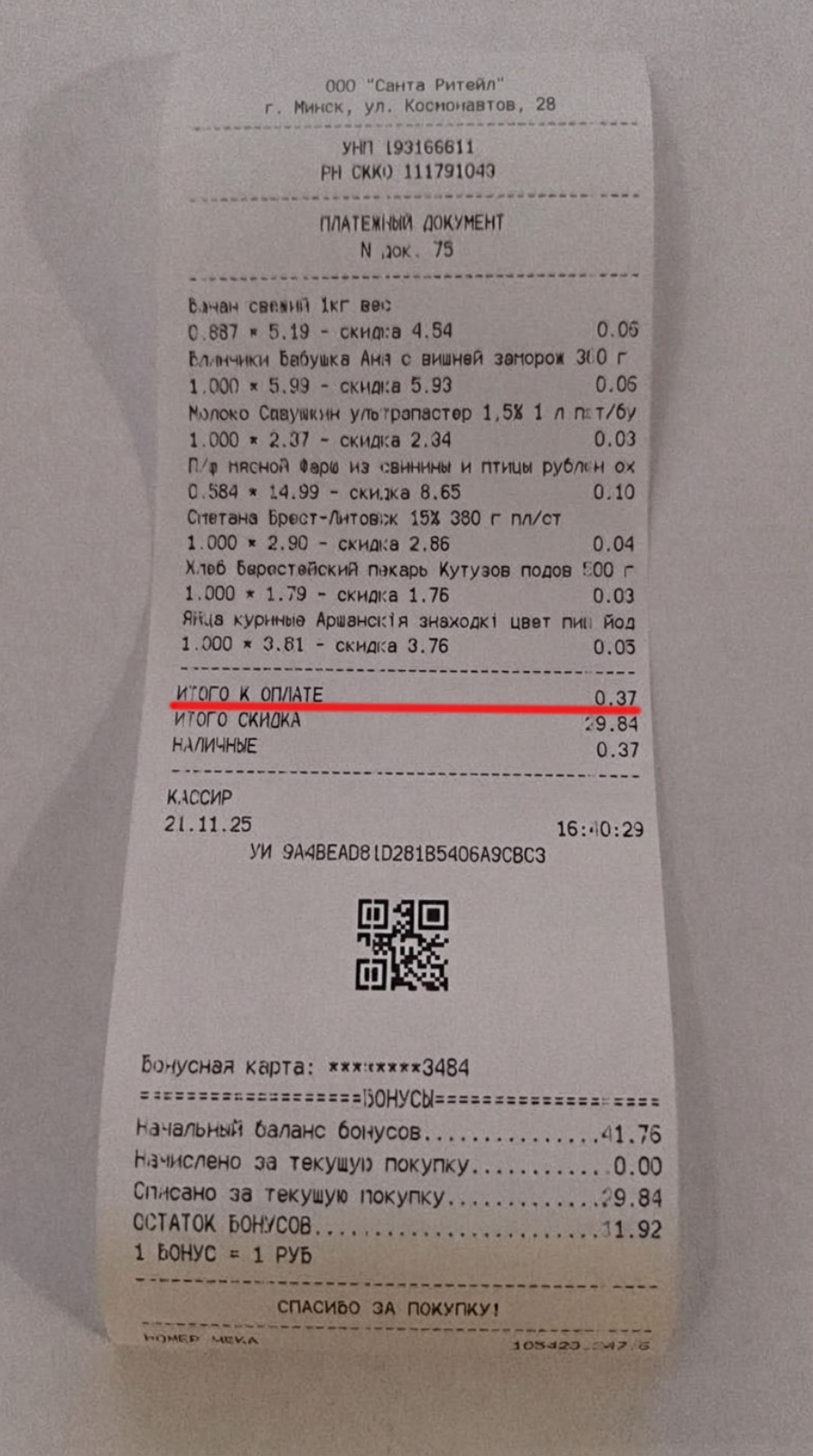 Более того, в чеке значился еще и остаток доступных бонусов на следующую покупку – Br11,92.