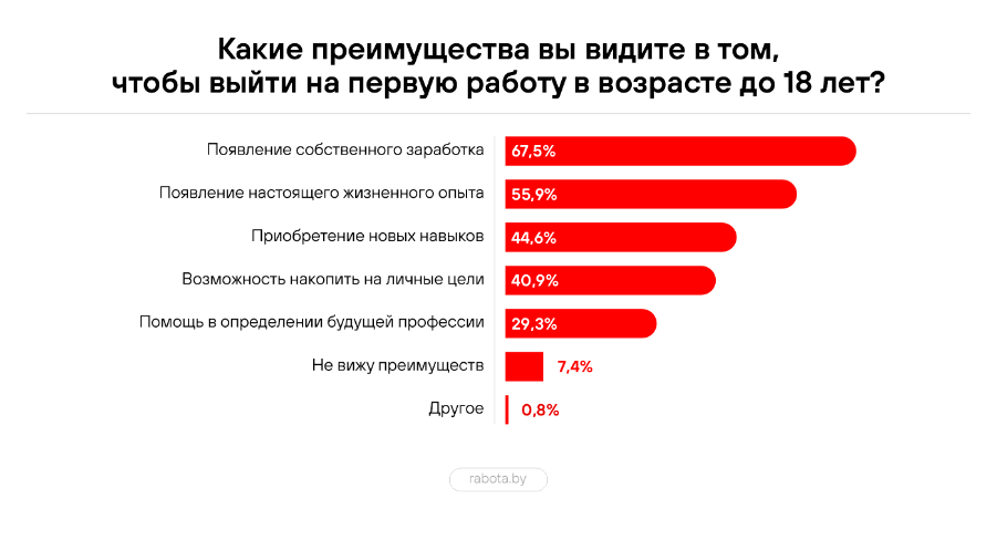 Главными плюсами ранней работы участники опроса называют появление собственного заработка, жизненный опыт и приобретение новых навыков.