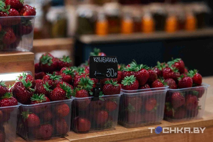 "Все натуральное, выращиваем фактически в диких условиях, без химии. Плантации расположены у леса в Логойском районе. И там растет не только клубника, малина тоже имеется. Но продавать ее позже будем, пока еще не созрела", – рассказывает девушка у прилавка "Ягодная поляна".