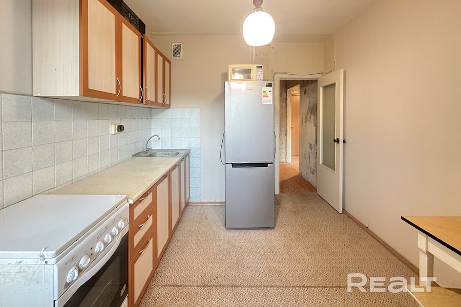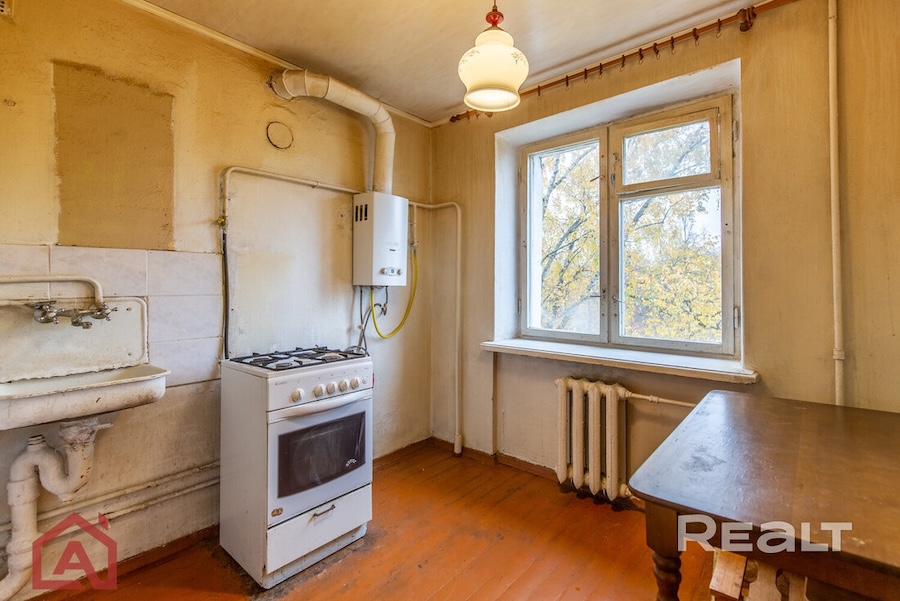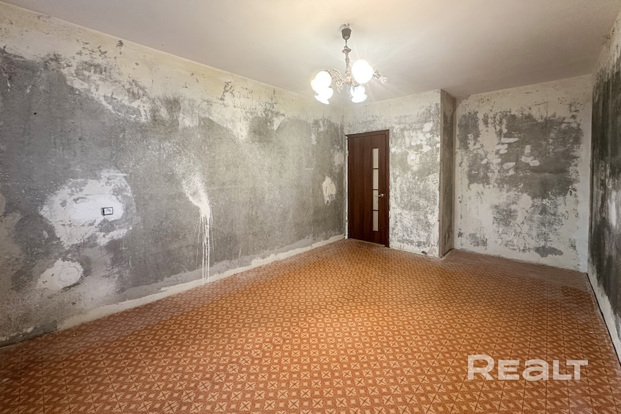 Собственники подготовили квартиру к ремонту: убрали мебель, технику и очистили стены. На кухне остался кухонный гарнитур.