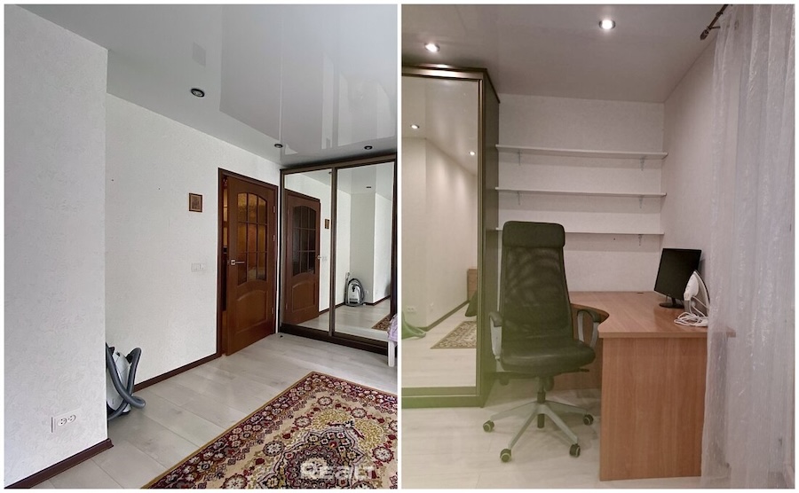 Жилье предстоит отремонтировать. Всю мебель собственники вывезли. На полу лежат доски, в комнате установлены стеклопакеты. Из жилой части есть выход на открытый балкон, где предусмотрены две ниши для хранения вещей.