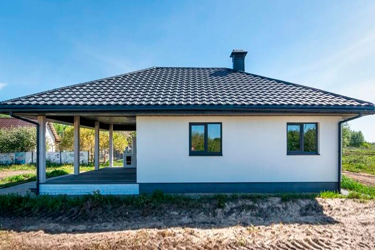 В доме две спальни, кухня-гостиная с выходом на крытую террасу, санузел и прихожая. Терраса застелена доской ДПК, на ней сложена печь для барбекю.