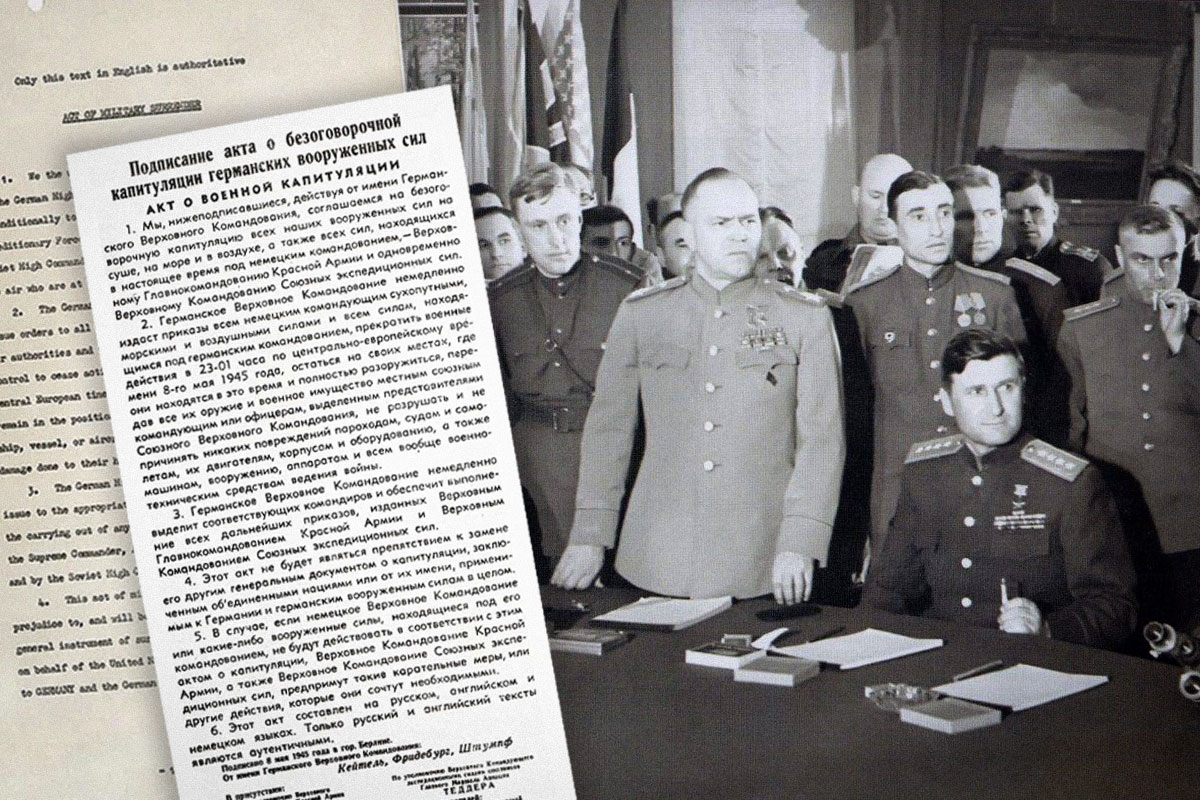 От лица Третьего рейха документ скрепил своей подписью генерал-полковник Альфред Йодль. Американцев и англичан представлял генерал Уолтер Беделл Смит, СССР – генерал-майор Иван Суслопаров.