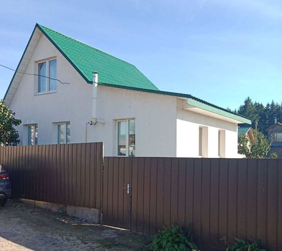 Дом здесь построен в 2013 году из кирпича. Фасад оштукатурен и покрашен (утепление – под вопросом). На крыше металлочерепица.