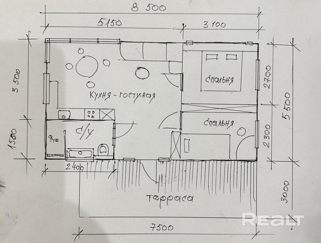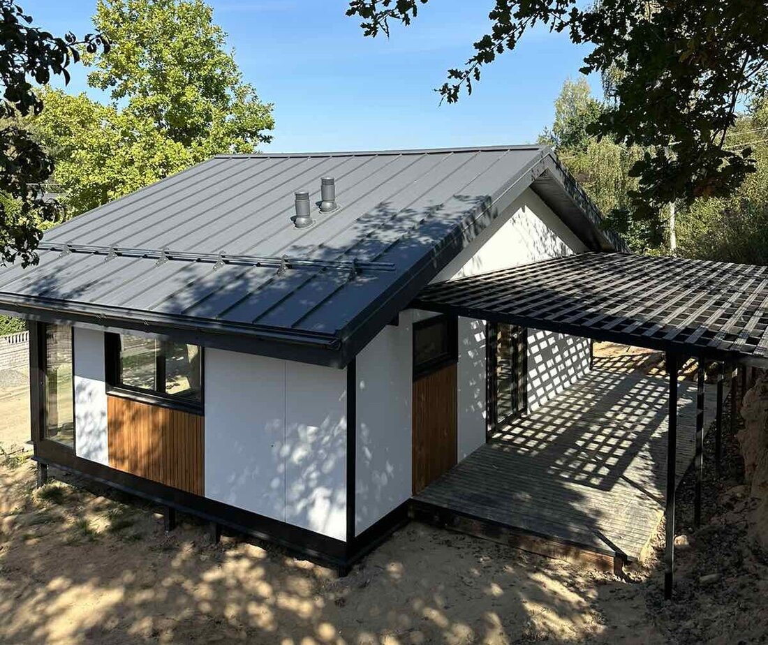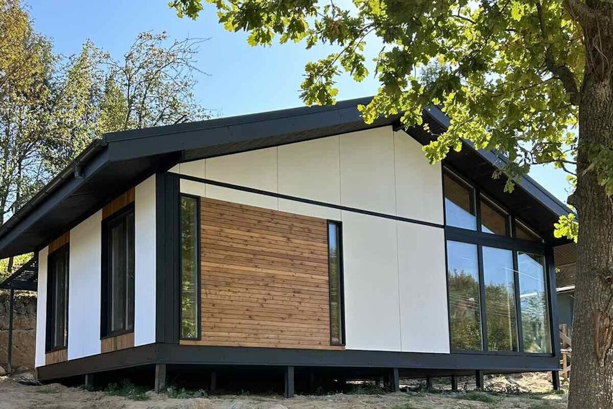 Дом 2018 года постройки с уютной террасой включает две раздельные спальни, кухню-гостиную и совмещенный санузел. Общая площадь – 70 "квадратов".