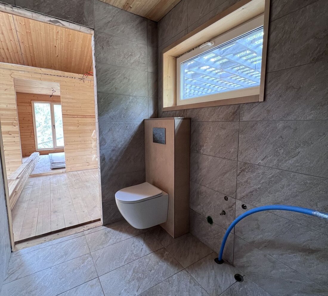 Дом здесь совершенно новый, в нем никто не жил. Чистовая отделка – на завершающем этапе. Строение каркасное, утепление – 200 мм. Отделка стен – плиты ЦСП, рейка сибирской лиственницы. Крыша фальцевая. Фундамент - металлические сваи. Внутри стены обшиты вагонкой.