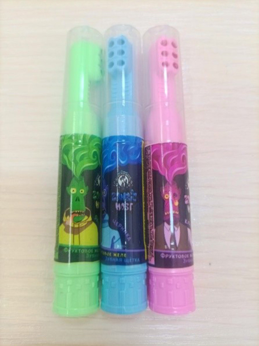 Потенциально опасной сладостью оказалось желе фруктовое "ZOMBIE МОЗГ" в тюбике в форме зубной щетки в полимерной упаковке, масса нетто – 7 г.