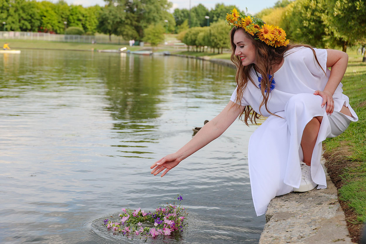 Картина, которую могли видеть минчане, сделала этот июльский вечер по-настоящему белорусским. Девушки в национальных костюмах с цветочными венками в руках и на головах спускались к Свислочи.