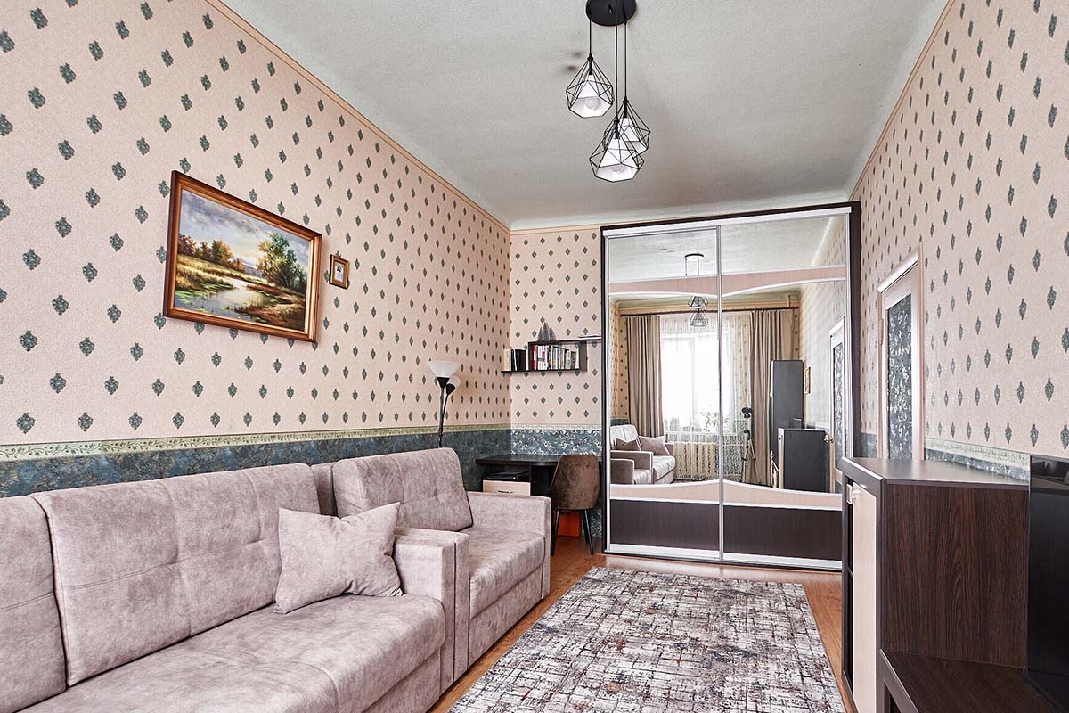 Квартира нуждается в ремонте. Тут стоят старая мебель и техника. Окна выходят на разные стороны.