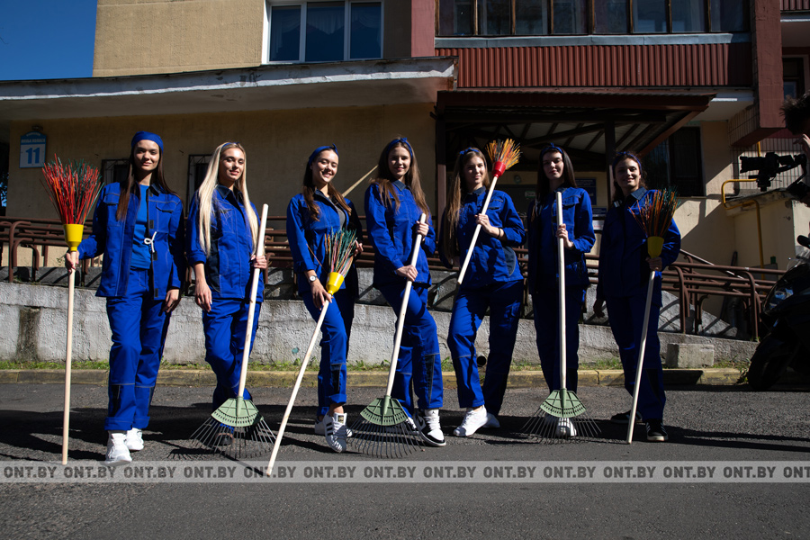Работы хватило: участницы конкурса красоты расчищали площадки от мусора, мешали клей и помогали загружать песок.