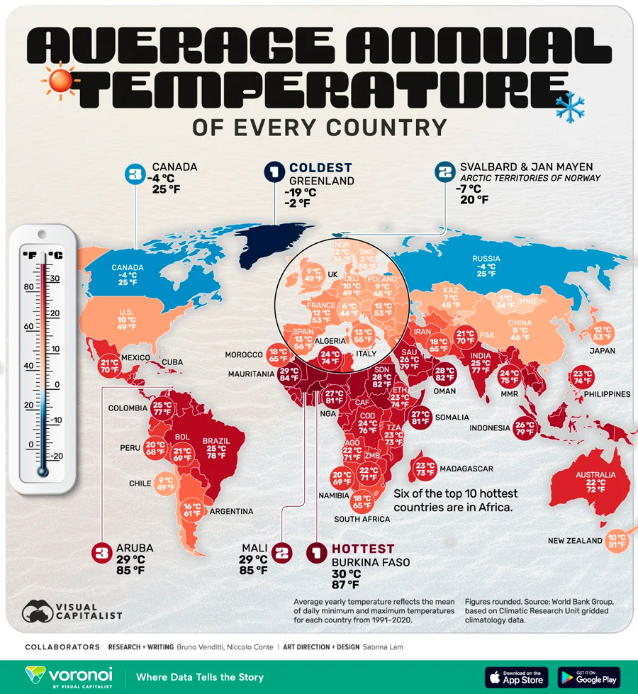 Самой жаркой страной мира, согласно тому же топу, признана Буркина-Фасо со средней температурой +30,40°C. В первую пятерку также входят Мали (+29,21°C), Аруба (+29,17°C), Сенегал (+28,90°C) и Мавритания (+28,82°C). Большинство самых теплых стран сосредоточено в Африке и других тропических регионах.