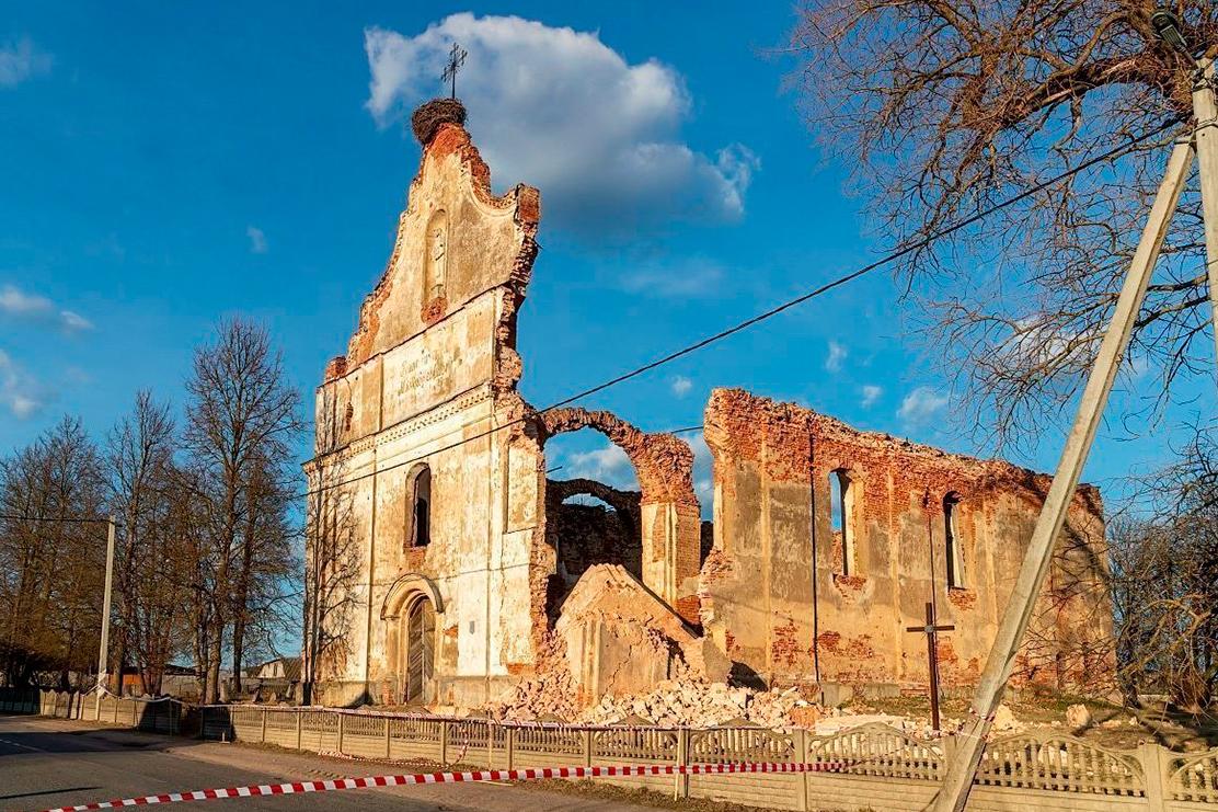 Костел в Зембине превратился в угрозу для соседних домов в апреле – тогда обрушился один из его сводов, и стало понятно, что многотонный фасад сооружения также может упасть на прилегающие участки.