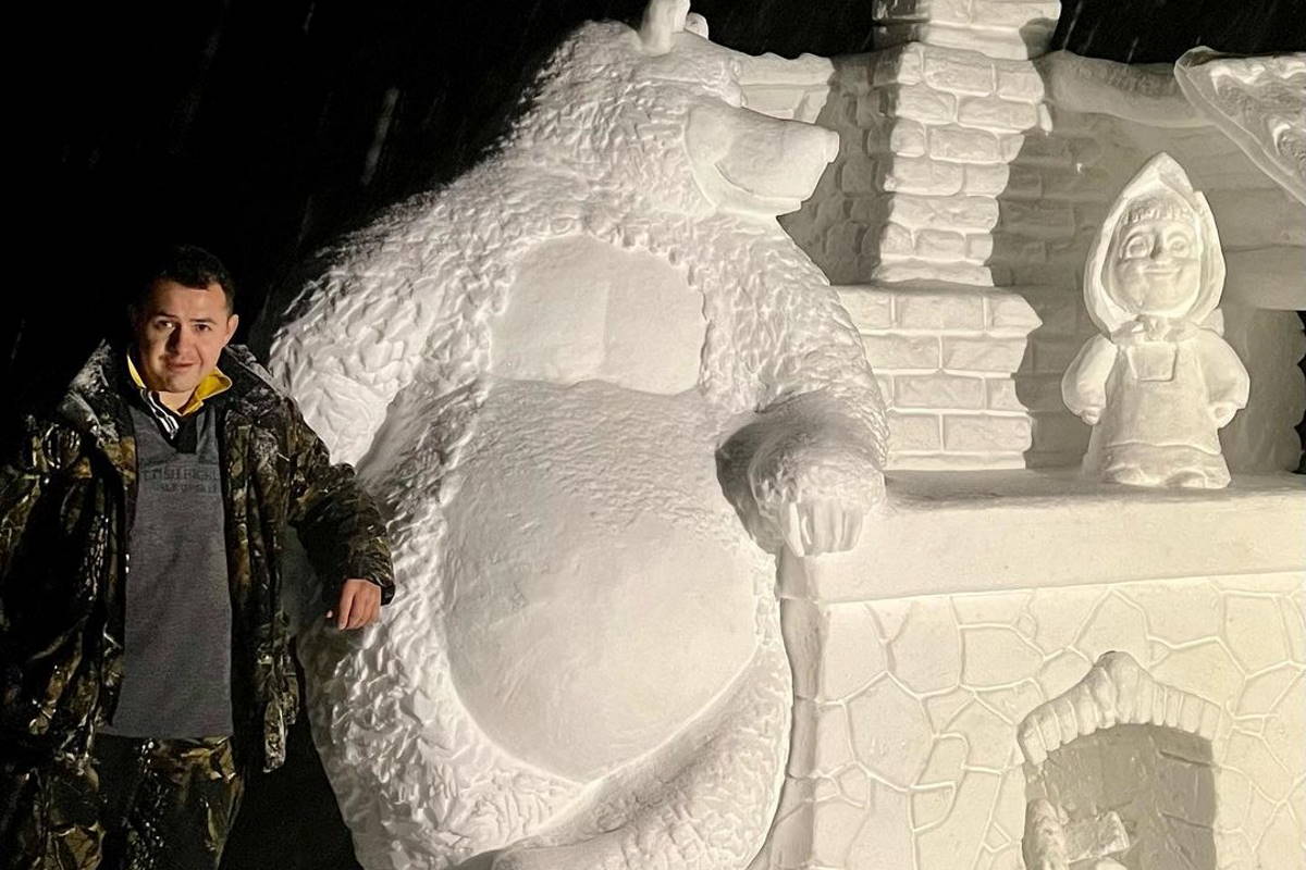 Минчанин Иван Карпицкий вылепил огромную скульптуру Маши и медведя. Композиция получилась максимально зимней, ведь в качестве материала использовался снег. Высота медведя – два метра, Маши – поскромнее, но автор поставил озорную девочку на печь в избе.