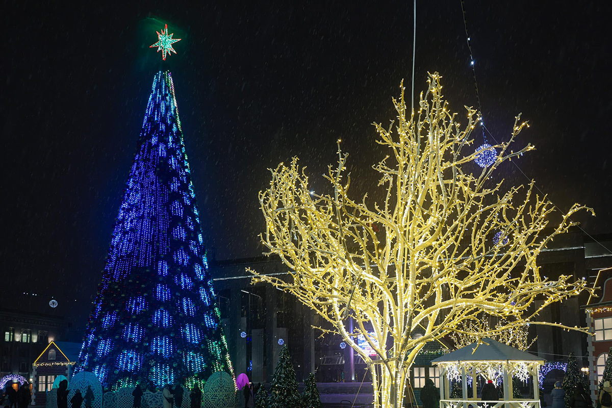 Это не единственный примечательный объект на площади: возле дома правительства "бьет" световой фонтан, а фонари и деревья дополнительно обмотали праздничными огоньками.