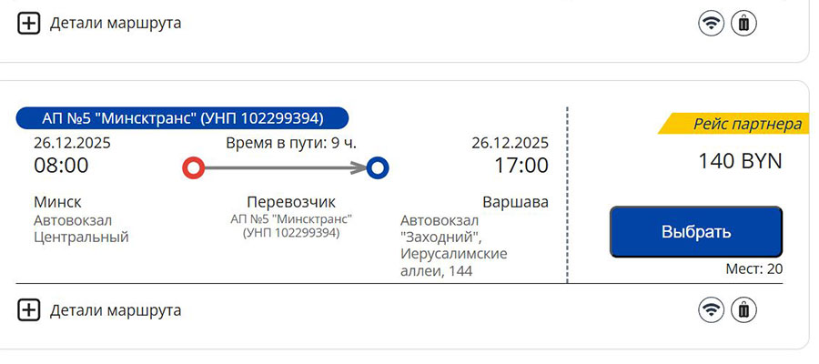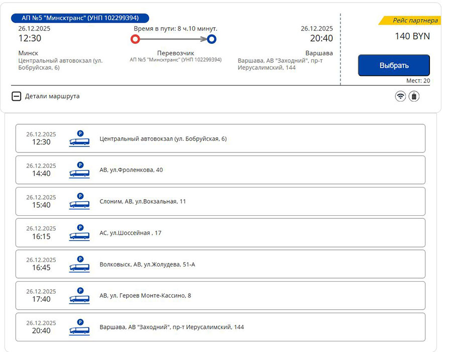 Отправляться транспорт будет с автовокзала "Центральный" в белорусской столице в 8:00 и 12:30. По пути следования его такие белорусские города, как Барановичи, Слоним, поселок Зельва, Волковыск и польский Белосток.